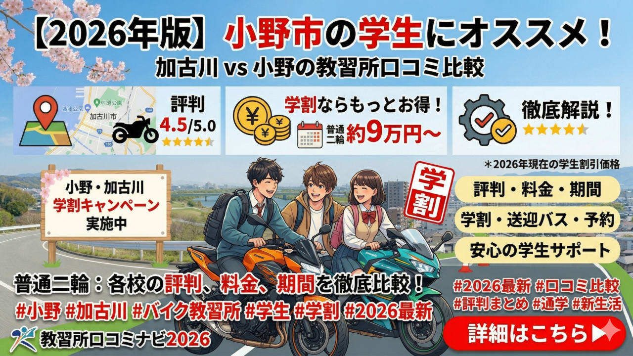 この記事では、実際に通った人の口コミをもとに2校を比較し、「小野市からどちらが通いやすいか」を整理します。料金・スケジュール・通いやすさ・雰囲気など、教習所選びで気になるポイントを一緒に確認していきましょう。